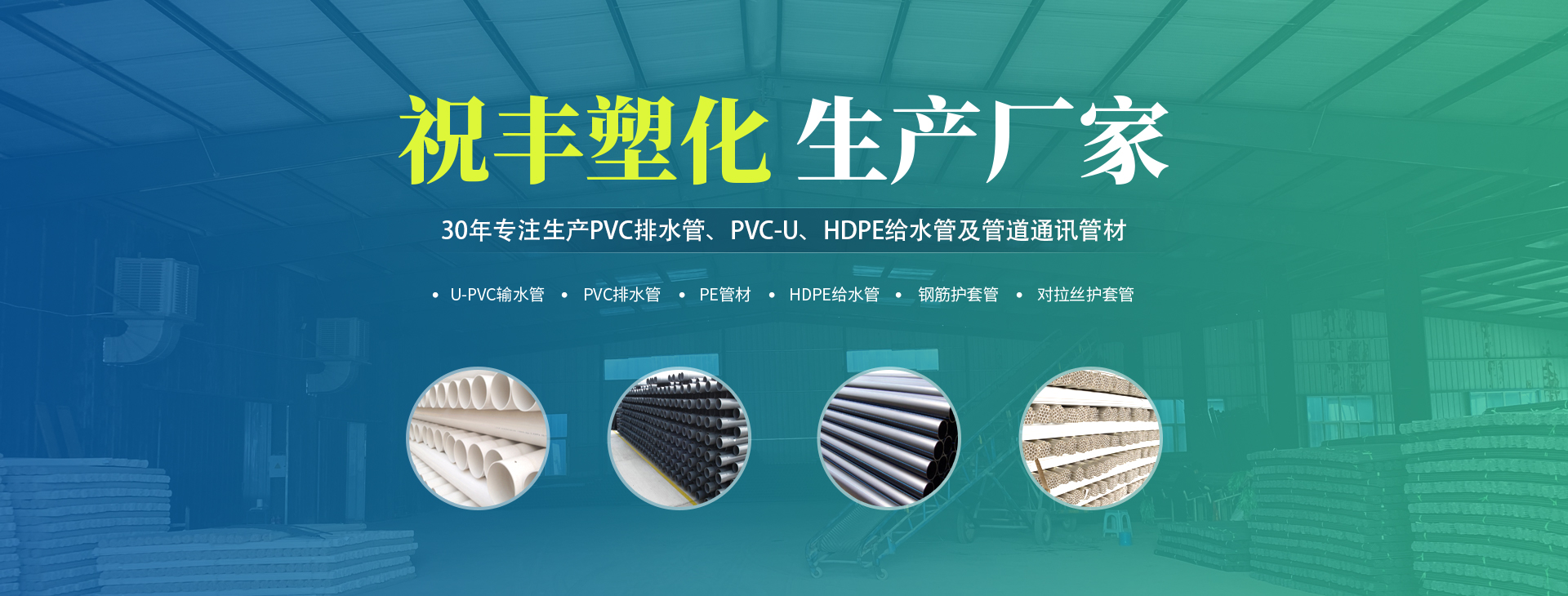 安阳市祝丰塑化有限公司坐落在滑县工业园区,东临大广高速,西临京珠高速,是郑州、鹤壁、安阳、濮阳四个城市的输纽,交通便利、环境优美。       公司始建于八十年代,经过二十余年的艰辛创业,规模不断壮大,由十多万元资产的小厂,发展到现占地面积达一万多平,建筑面积一万平,资产2000多万元管材生产企业。公司生产PVC-U、PVC排水管、HDPE给水管、钢筋护套管管道通讯管材等产品,广泛用于农田节水、高山引水、人畜用水、建筑、电力通讯等多种用途,品种齐全。为了满足用户需求,可承揽各种给水、节水、灌溉工程。“祝丰塑化”凭借强劲的实力,优良的管理水平?!耙灾柿壳笊妫孕庞蠓⒄埂钡脑蛉σ愿昂痛蠹夜餐茉烀篮梦蠢础?.